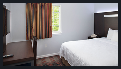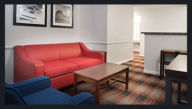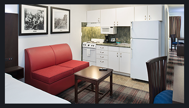 All the comfort and privacy of home is offered in our two room suites with a private bedroom with TV (40" in living room and 32" in separate bedroom) and queen size bed, bathroom with tub/shower combo and separate living room with sleeper sofa, coffee table, small dining table, TV (40" in living room and 32" in separate bedroom). Enjoy a full kitchen complete with full size refrigerator with ice-maker, 4 burner range/oven, microwave, coffee-maker, sink and lots of cabinets stocked with dishes and utensils. Free high speed internet access and local calls are also included.