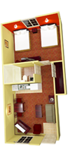 Our One-Bedroom Suites with two rooms and two queen beds in the bedroom area, offers a spacious bedroom with television plus, bathroom with tub/shower combo and separate living room with sleeper sofa, coffee table, small dining table, TV (40" in living room and 32" in separate bedroom). Enjoy a full kitchen complete with full size refrigerator with ice-maker, 4 burner range/oven, microwave, coffee-maker, sink and lots of cabinets stocked with dishes and utensils. Free high speed internet access and local calls are also included.