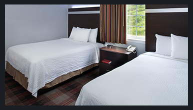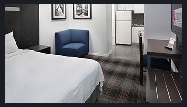 All the comfort and privacy of home is offered in our two room suites with a private bedroom with TV (40" in living room and 32" in separate bedroom) and queen size bed, bathroom with tub/shower combo and separate living room with sleeper sofa, coffee table, small dining table, TV (40" in living room and 32" in separate bedroom). Enjoy a full kitchen complete with full size refrigerator with ice-maker, 4 burner range/oven, microwave, coffee-maker, sink and lots of cabinets stocked with dishes and utensils. Free high speed internet access and local calls are also included.
