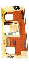 Experience the ultimate in comfort and privacy with these three room suites offering two private bedrooms with TVs (40" in living room and 32" in separate bedroom) and queen size bed, one bathroom with tub/shower combo and separate living room with sleeper sofa, coffee table, small dining table and full kitchen complete with full size refrigerator with ice-maker, 4 burner range/oven, microwave, coffee-maker, sink and lots of cabinets stocked with dishes and utensils. Free high speed internet access and local calls are also included.